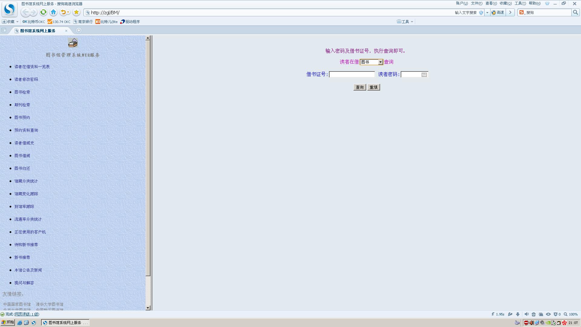 +浏览器/服务器(Browser/Server)模式,在服务器上安装本部件后各客户机就可以通过IE浏览器让读者使用借阅资料查询、更换密码、预约、资料检索等功能。